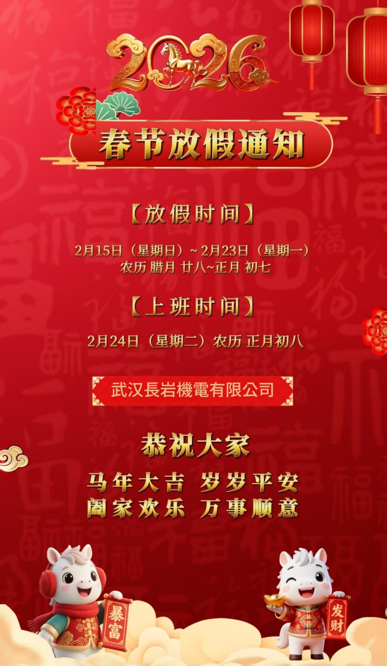 一、春节放假时间定为2026年2月15日(廿八)-2月23日(初七)共9天